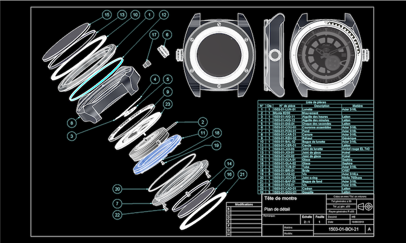 acier inoxydable 316L, laiton, verre saphir, bracelets issus de manufactures françaises reconnues.